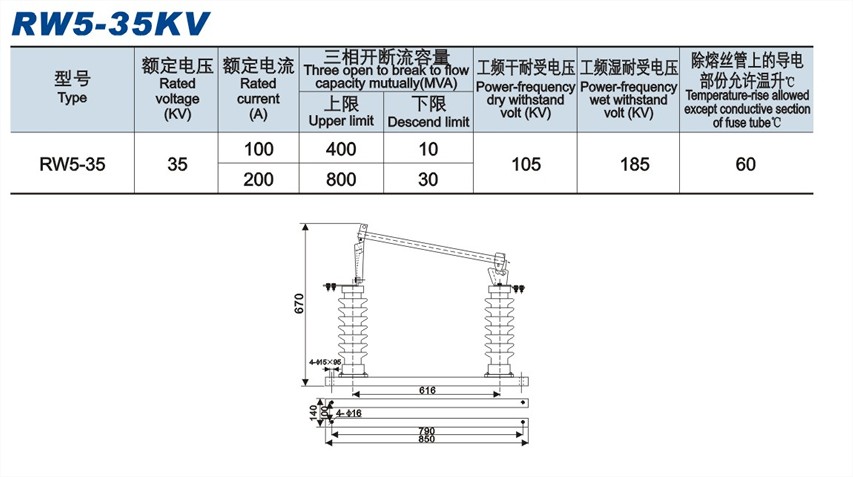戶外高壓跌落式熔斷器適用于35kv及以下電壓頻率50Hz電力系統中,作輸電線路、電力變壓器過載和短路保護,分合額定負荷電流只用,機械壽命≥2000次。